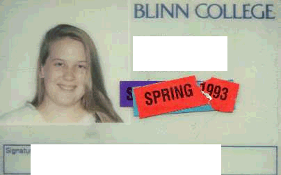 Here are the ID cards from the different Universities I went to. (Please remember they _ARE_ ID cards, and id card pictures are always horrible) First, fresh out of High School, I went to Texas Tech University. Then I found LPMuds and the internet, and failed out. Next I went to Richland Jr. College, they didn't have a picture ID, and it was just paper, so I didn't keep it. Then I met a boy, and moved to College Station, so I went to Blinn College. Then the boy and I broke up, so I moved back home and went to East Texas State University. It was at ETSU that I finally, actually graduated. :) In case you haven't noticed. I blocked out my name and my SSN. I figure if you don't know my name, you probably don't need to know it, and pretty much no matter who you are, you don't need to know my SSN. Page last updated on Saturday, July 03, 1999